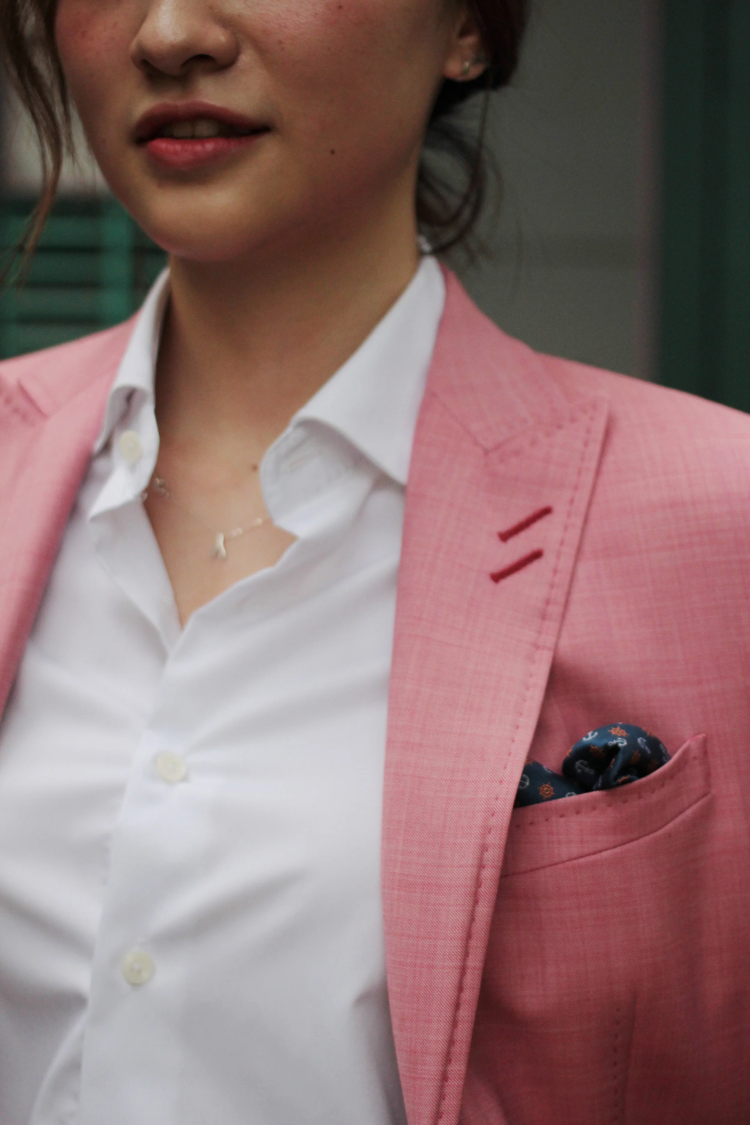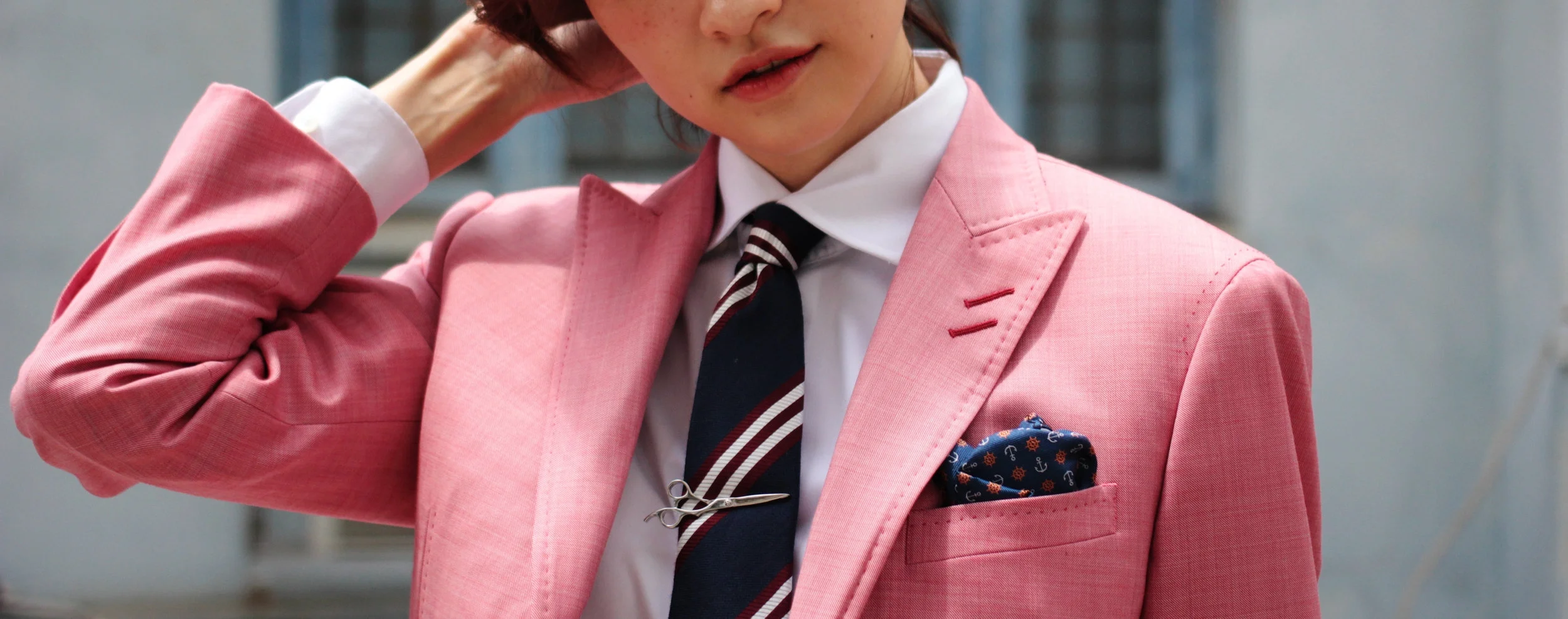 Single breasted suit with peak lapels and double lapel holes for special effects.
